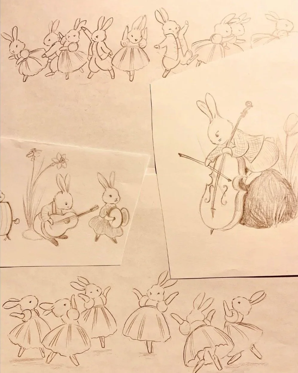 When I am working on a book, I start by reading the manuscript and jotting down notes and thinking about the characters. I will often come up with a few character designs before I start anything else. I then reread the story and start on thumbnails. These are small sketches that give a general idea of what an illustration will look like. I often do several of these for each page of a book. I like to see how they work together before deciding which to use. An illustrator divides the text of a book into 32 pages (sometimes 40). In this phase, I'll often work out the general colour palette for the book too.