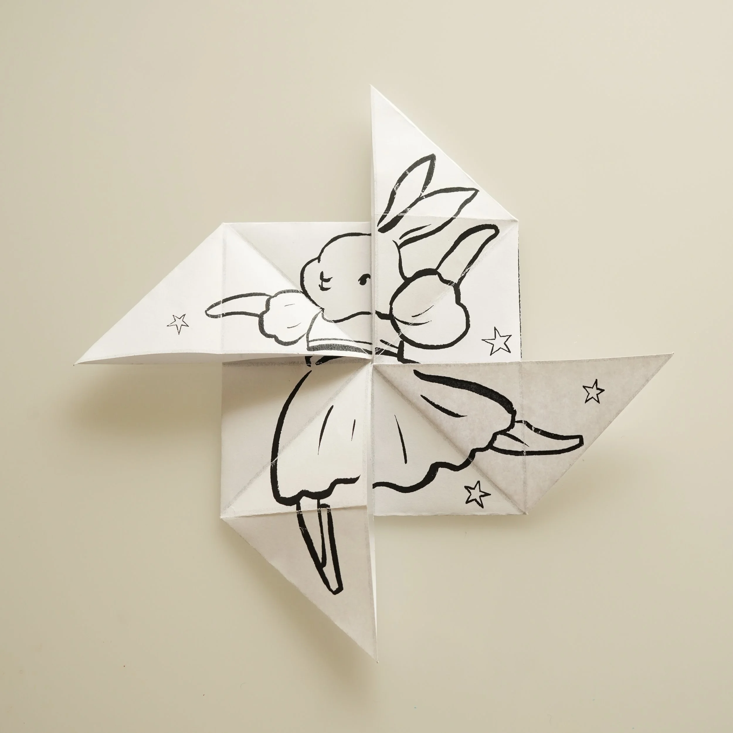 Instructions for folding are at the bottom of the page. Flip to black side. Fold corners in to center - then out. Fold sides in. Fold bottom and top in to form a small square. pull out edges to form points. These will be the arms and legs that can be played with.
